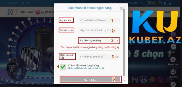 Cuối cùng, nhấn “Xác nhận” để lưu thông tin tài khoản ngân hàng vào Kubet. Bây giờ, tài khoản ngân hàng này sẽ được Kubet sử dụng để chuyển tiền cho bạn.