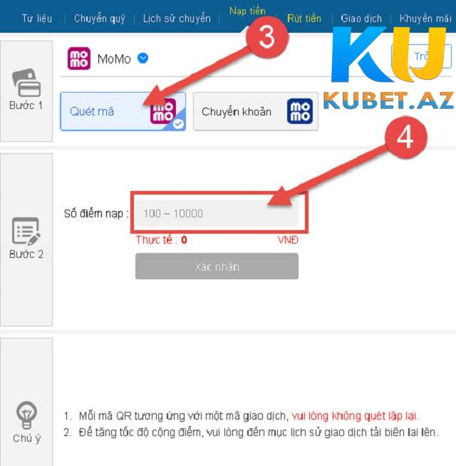 Bước 1: Truy cập vào giao diện “Nạp tiền” trên Kubet, sau đó chọn phương thức nạp tiền qua Momo. Nhập số điểm nạp mong muốn trong khoảng từ 100 đến 10.000 điểm và nhấn Xác nhận.
