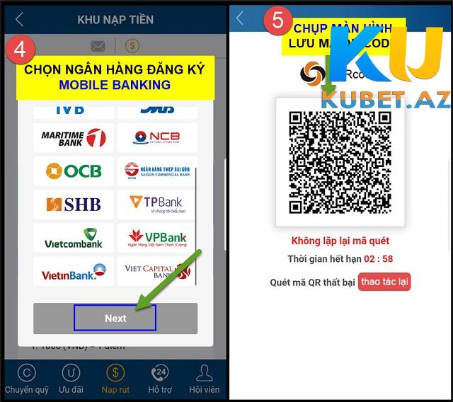 Bước 4: Đăng nhập vào tài khoản ngân hàng trực tuyến của bạn và chọn chức năng chuyển tiền bằng QR pay để quét mã QR code của Kubet. Sau khi quét mã QR code thành công, giao dịch nạp tiền sẽ được xử lý bởi Kubet.