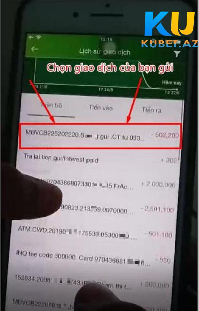 - Tại mục “Lịch sử giao dịch”, bạn sẽ thấy danh sách các giao dịch chuyển tiền bạn đã thực hiện. Hãy chọn giao dịch tương ứng với chuyển tiền tới tài khoản ngân hàng Kubet.